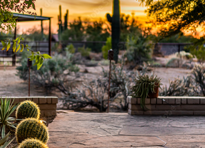 All hardscape elements use eco-friendly materials suitable for hot, dry climates.